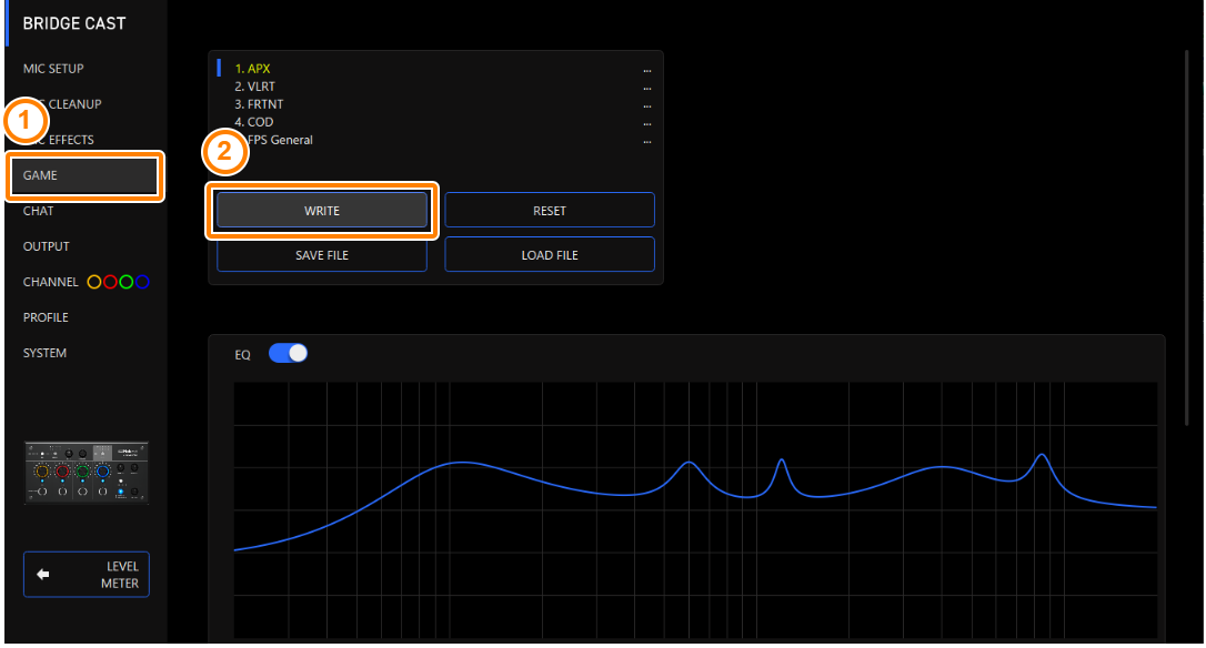 On the menu screen, click the “GAME” tab and then click the preset you want to recall.