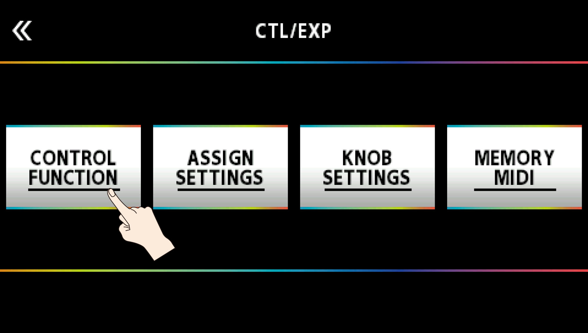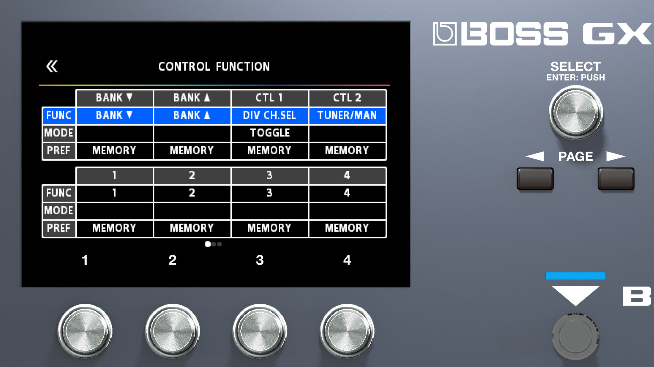 The GX-100 lets you arrange multiple pedal effects in the effect chain like FOOT VOLUME, WAH and so on. In CONTROL FUNCTION, the pedal effect placed at the beginning of the chain (or at “A CH” in DIV/MIX) is enabled. |
