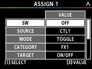 - Turn the [1] knob to move the cursor to the ASSIGN row.
