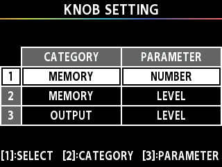 - Turn the [1] knob to move the cursor to the “KNOB SETTING” row.