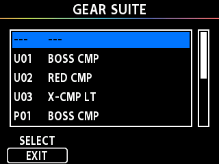 Der GX-1 verfügt über mehrere empfohlene Einstellungen für jeden Effekt. Die Funktion zum einfachen Abrufen dieser Einstellungen wird als „GEAR SUITE“ bezeichnet.