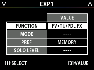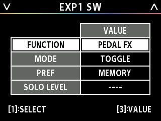- Ruotate la manopola [1] per spostare il cursore su “FUNCTION”, e ruotate la manopola [3] per impostare VALUE su “PEDAL FX”.