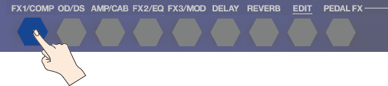 从演奏屏幕上编辑效果可以从效果链屏幕与演奏屏幕编辑效果。长按想要编辑的效果按键。将显示编辑屏幕。备注按下效果按键以打开/关闭效果。转动旋钮 [1]–[3] 为参数设置值。可以使用 [å] [ä] 按键移动光标。按下 [EXIT] 按键返回演奏屏幕。