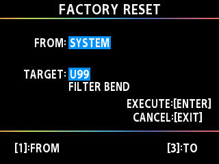 - 通过使用 [1] 与 [3] 旋钮设置 <FROM> 与 <TO>,指定恢复出厂设置的范围。