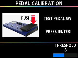 - 如果想要更改 PEDAL FX 指示灯的照明敏感度,使用旋钮 [3] 调节 THRESHOLD 值,然后反复用力踩下踏板脚趾一侧,直至达到目标敏感度。