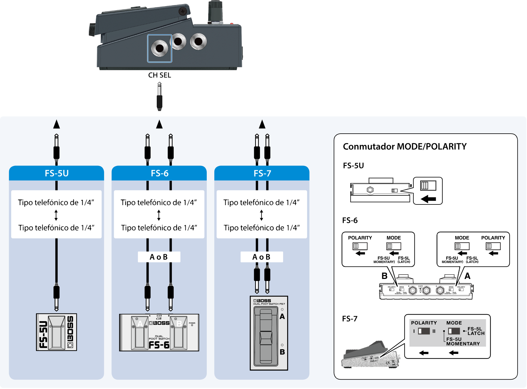 - Cuando haya un cable estéreo conectado a A y B (conectores) en los conmutadores FS-6 o FS-7, utilice el conmutador de pedal B.