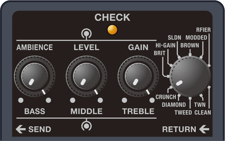 Ruotate le manopole [AMBIENCE], [LEVEL] e [GAIN] completamente in senso antiorario, e ruotate le manopole [BASS], [MIDDLE] e [TREBLE] completamente in senso orario.