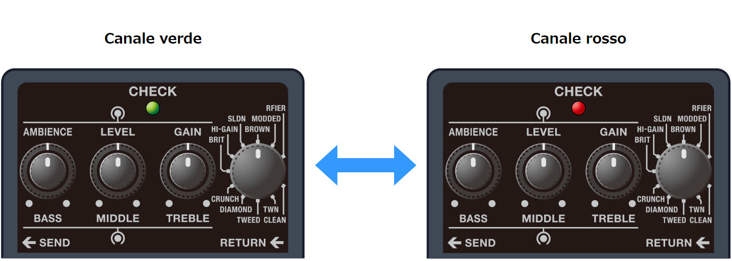 Quando l’indicatore CHECK si illumina in verde, state utilizzando il canale verde, e quando l’indicatore CHECK si illumina in rosso, state usando il canale rosso.
