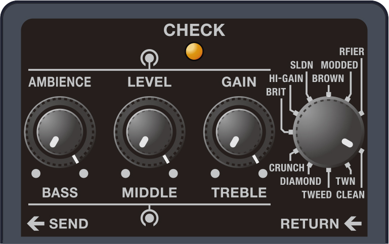 Ruotate le manopole [AMBIENCE], [LEVEL] e [GAIN] completamente in senso antiorario, e ruotate le manopole [BASS], [MIDDLE] e [TREBLE] completamente in senso orario.