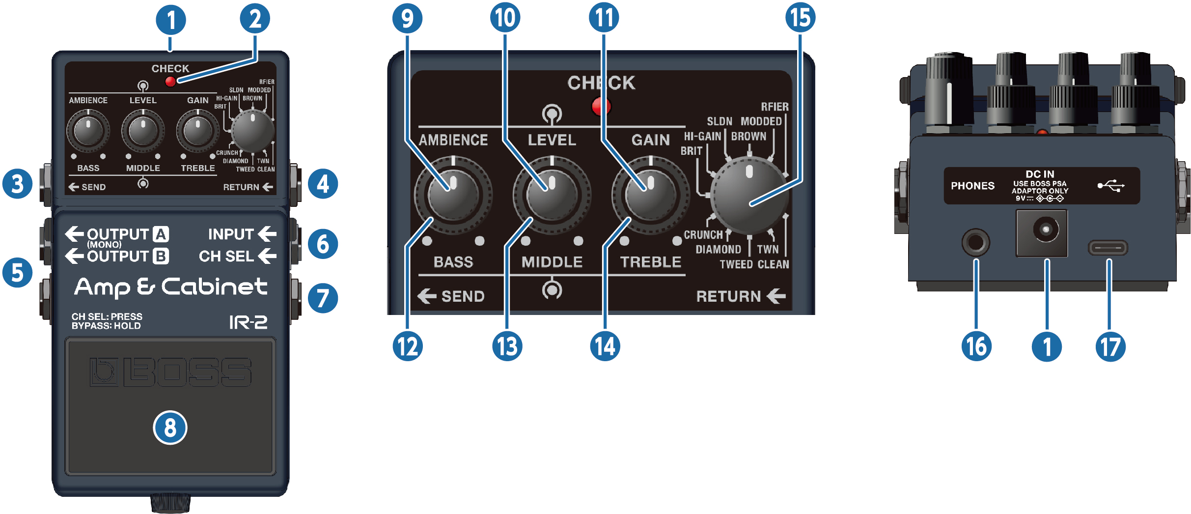 7 | Presa CH SEL | Collegate un interruttore a pedale (FS-5U, FS-6, FS-7; venduto separatamente) per alternare tra i canali. Quando è collegato un interruttore a pedale, l’interruttore a pedale dell’unità attiva solamente la funzione bypass.
