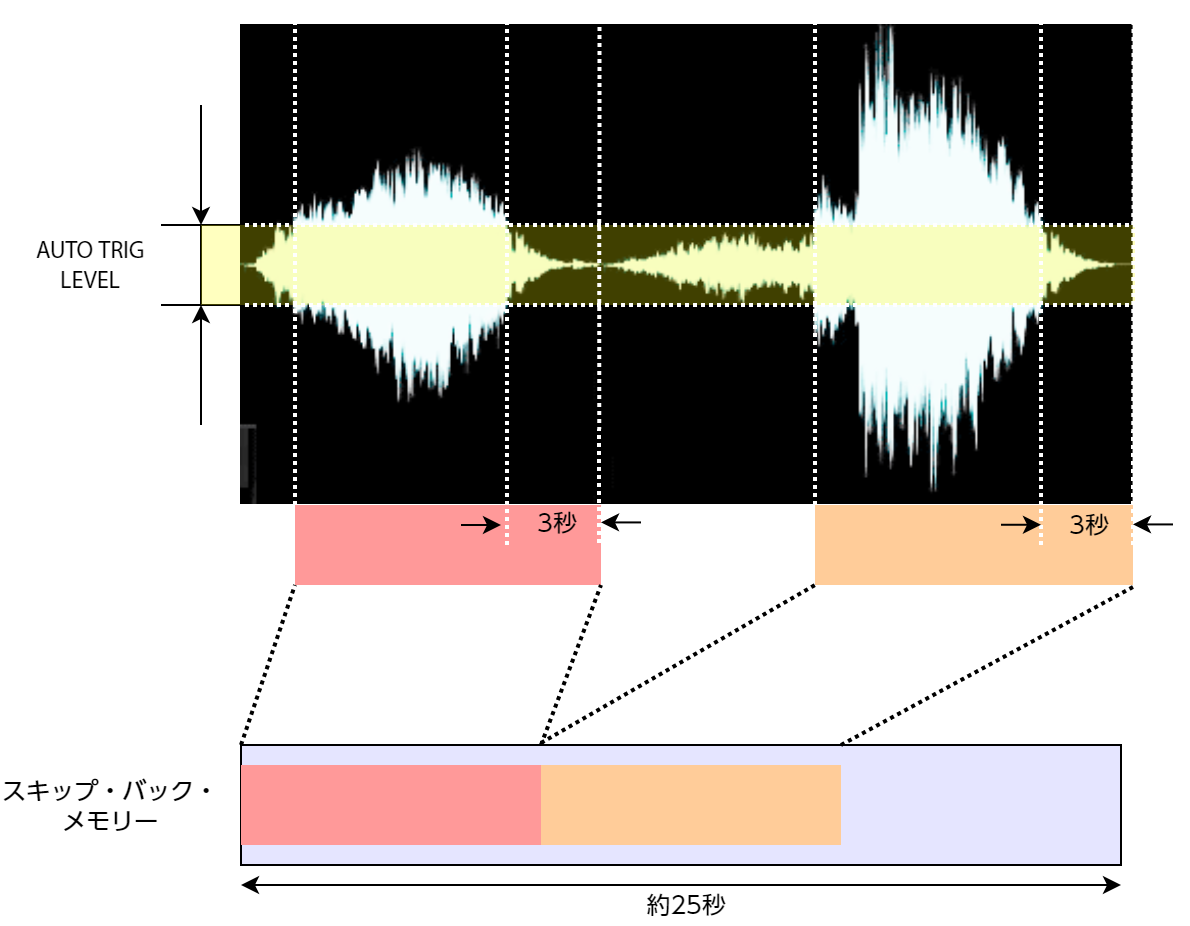 - スキップ・バック・メモリーに録音される音声は、Auto Trig Levelパラメーターによって録音開始/一時停止がコントロールされます。Auto Trig Levelパラメーターで設定したレベルを超える音声が入力されると、スキップ・バック・メモリーに録音が始まります。また、Auto Trig Levelパラメーターで設定したレベルを下回る状態が3秒間続くと、スキップ・バック・メモリーへの録音は一時停止します。