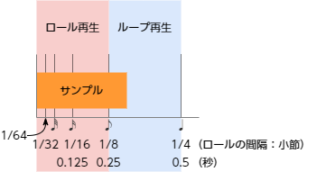 以下は、テンポが120(BPM)で、サンプルの長さが4分音符(0.5秒)に満たない場合の、ロール再生またはループ再生される条件を表しています。