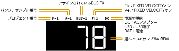 SP-404MK2の電源を入れ、演奏できる状態になると、トップ画面が表示されます。