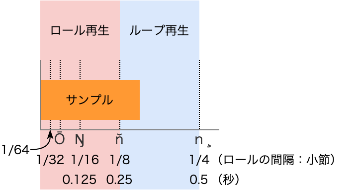 - [SHIFT]ボタンを押しながら、[ROLL]ボタンを押します。 - ロールの間隔を設定します。[SHIFT]ボタンを押しながら[ROLL]ボタンを押すたびに、4分音符(1/4)Ó8分音符(1/8)Ó16分音符(1/16)Ó32分音符(1/32)Ó64分音符(1/64)とロールの間隔が変わります。   - ロールの間隔(設定値)がサンプルの長さより長い場合は、ループ再生されます。 - 以下は、テンポが120(BPM)で、サンプルの長さが4分音符(0.5秒)に満たない場合の、ロール再生またはループ再生される条件を表しています。  - ロールの間隔を1/64~1/8に設定したときは、ロール再生されます。 - ロールの間隔を1/4に設定したときは、ループ再生されます。