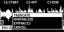 - [VALUE]つまみを回して項目を選び、[VALUE]つまみを押します。 - サンプルが加工されます。 - 項目 - 動作 - TRUNCATE - サンプルのスタート・ポイントより前と、エンド・ポイントより後ろの区間をトリミング(削除)します。 - NORMALIZE - ボリュームを全体的に大きくします。 - EMPHASIS - 高域の音を大きくします。 - CANCEL - メニュー画面を閉じます。