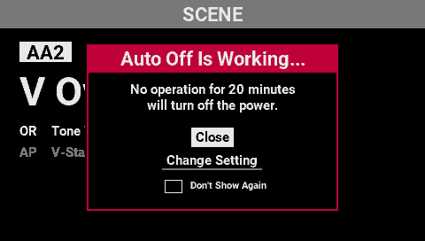 - If you move the cursor to “Don’t Show Again”, select the check box and then select “Close” to close the screen, the auto-off setting remains on (with a setting of 20 or 240 minutes), and this message is not shown again.