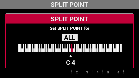You can divide the keyboard into two regions (left and right) and assign different parts to each. This is called a “split”, and the point at which the keyboard parts are separated is called the “split point”. The split point key is included in the right-hand region.