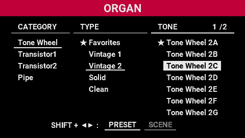 Press while holding down the [SHIFT] button | Changes whether tones are selected from presets or from scenes. | |