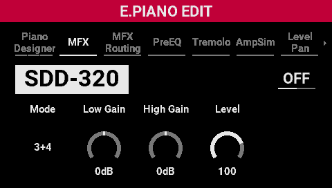 Edit the MFX for the part on this screen. There are menus for E.Piano, Synth A, Synth B, and Vocoder.