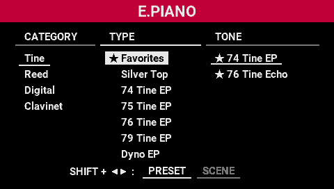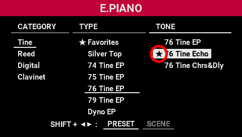 - To remove a tone from the favorites, move the cursor to the tone that’s registered as a favorite, and press the [TONE SELECT] knob while holding down the [SHIFT] button.
