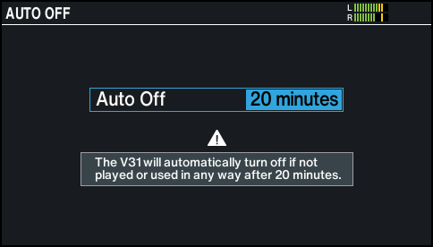如果将 Auto Off 功能设置为“20 分钟”或“4 小时”,则会在本设备关闭前的 10 分钟(“20 分钟”设置)或 30 分钟(“4 小时”设置)显示距离设备关闭的剩余时间。