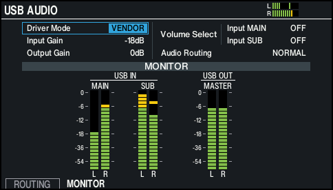 - [F2] (MONITOR):显示 USB AUDIO 电平表。