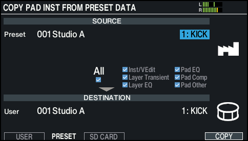 从用户存储位进行复制。可以交换复制源和复制目标鼓组,但前提是复制源位于用户存储位中。