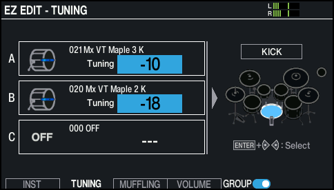 - By pressing the [F5] (GROUP) button, you can set the instruments (layers A–C) either as a set (on) or individually (off).
