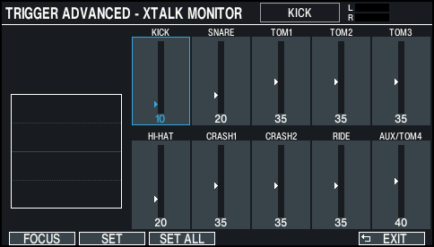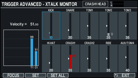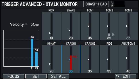 - If crosstalk is occurring for multiple pads, each press of the [F1] (FOCUS) button will move the cursor to another pad that is experiencing crosstalk.
