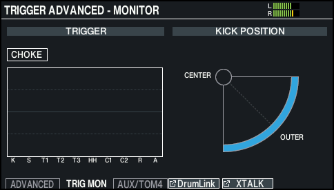 You can view real-time information that shows the force (velocity) with which each pad is struck, as well as the strike points for the snare, toms, hi-hat, ride cymbal and AUX.