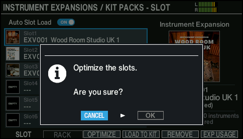 The slot area may become fragmented as you repeatedly load and remove Instrument Expansions/Kit Packs, which could reduce the number of Instrument Expansions/Kit Packs that can be imported.