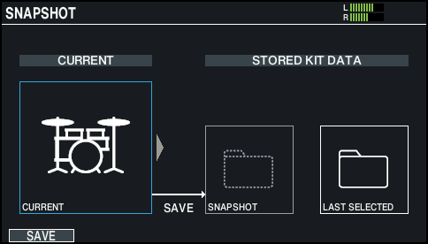 - The current drum kit settings are saved in SNAPSHOT.