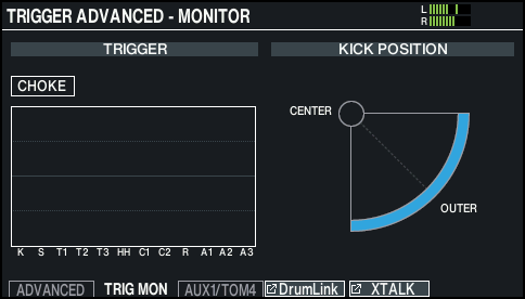 You can view real-time information that shows the force (velocity) with which each pad is struck, as well as the strike points for the snare, toms, hi-hat, ride cymbal and AUX.