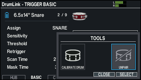 When the cursor is on a paired DWe pad in the DrumLink - HUB screen, you can also unpair the DWe pad by pressing [F6] (UNPAIR) while holding down the [SHIFT] button.