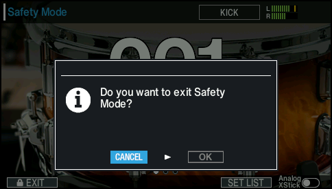 Disabling safety modePress the [F1] (EXIT) button.You can also press the [KIT] button while holding down the [SHIFT] button.Use the cursor buttons to select “OK”, and press the [ENTER] button.