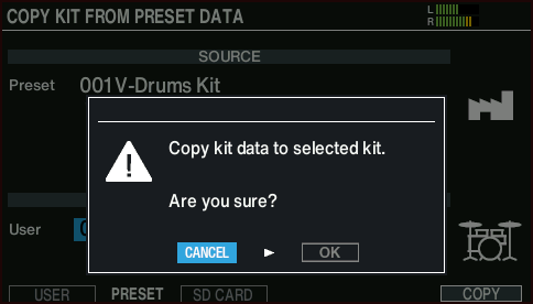 You can use the copy function to restore drum kits to their factory (preset kit) settings.