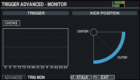 You can view real-time information that shows the force (velocity) with which each pad is struck, as well as the strike points for the snare, toms, hi-hat, ride cymbal and AUX.