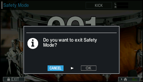 Disabling safety modePress the [F1] (EXIT) button.You can also press the [KIT] button while holding down the [SHIFT] button.Use the cursor buttons to select “OK”, and press the [ENTER] button.
