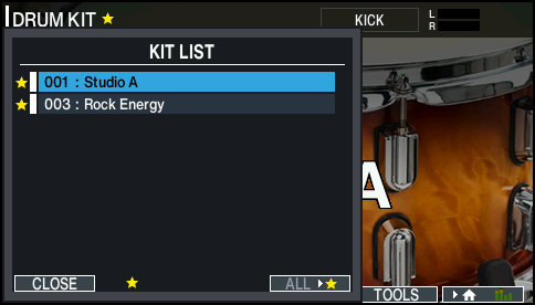 登録したドラム・キットを呼び出すKIT画面で、[F1](LIST)ボタンを押します。[F4](ËALLÏ)ボタンを押します。お気に入りに登録したドラム・キットの一覧が表示されます。カーソル[Ç][É]ボタンまたはダイヤルでドラム・キットを選びます。